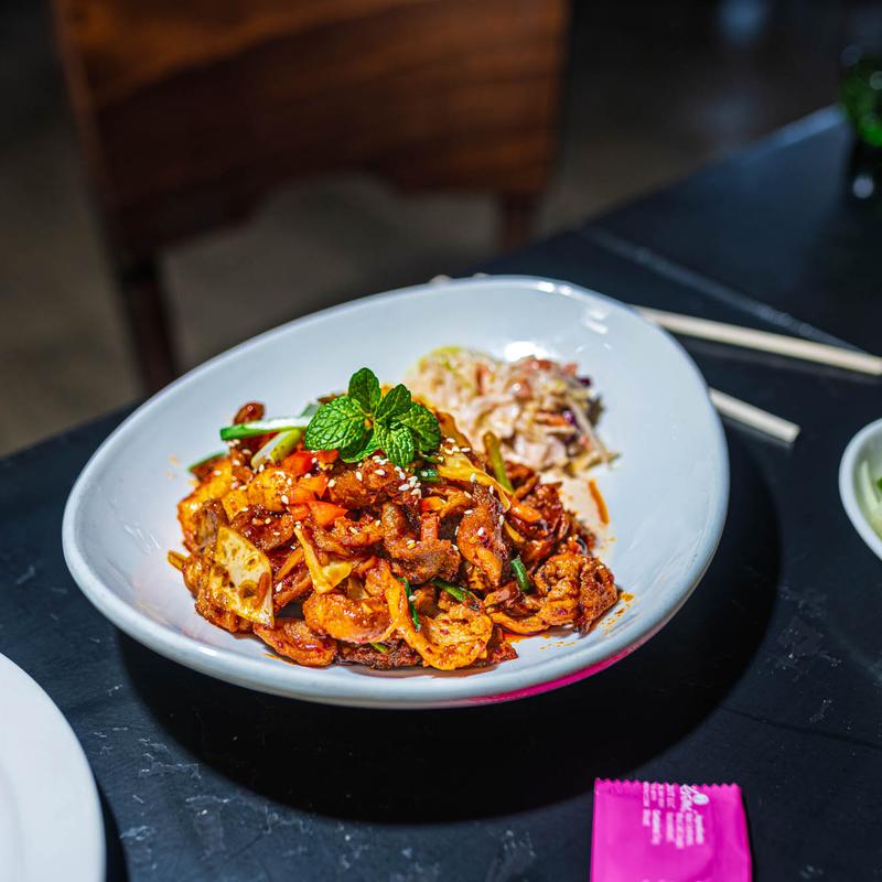 Spicy BBQ Pork & Rice Cakes